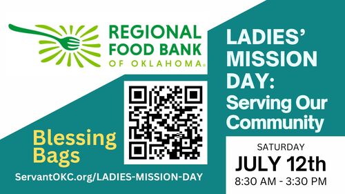 LADIES: Join us for a mission day on Saturday, July 12th! We will meet at the church at 8:30 a.m. and carpool to the Oklahoma Regional Food Bank where we will spend the morning sorting food for the food bank. We will then travel back to the church for lunch and spend the afternoon assembling Blessings Bags for people experiencing homelessness. If you are not available for the full day, you are welcome to sign up for just the morning or afternoon session.