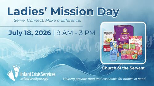 Join us for a meaningful day of service and fellowship at Church of the Servant on Saturday, July 18, 2026, from 9:00 AM–3:00 PM. This special Ladies’ Mission Day is an opportunity to come together, build community, and make a tangible impact for families in need right here in Oklahoma City.